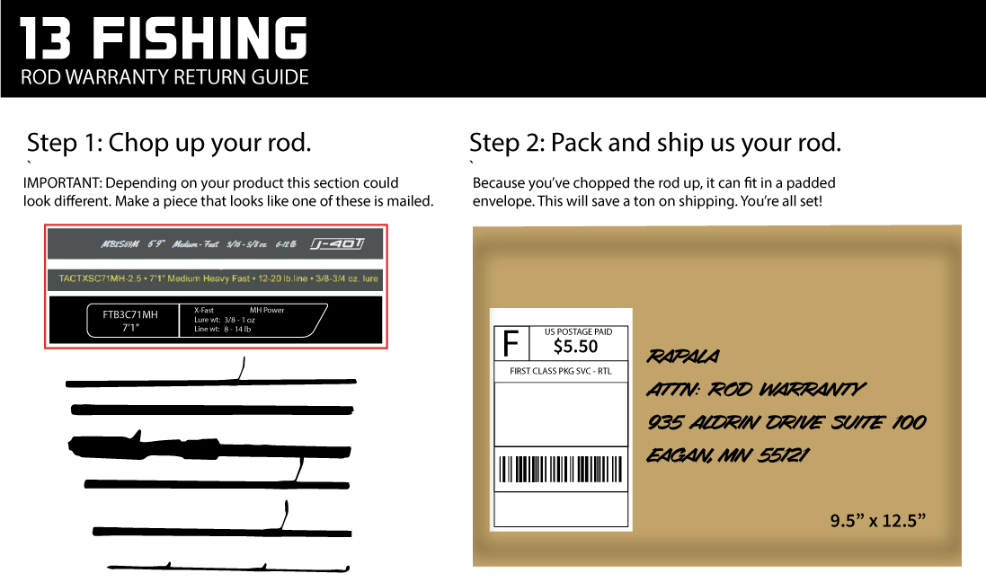 How it works: Ship us your rod and requested information to the below address. In the package, you must include the section of the rod with the portion that contains the model number, a completed Rod Replacement Form and proof of purchase such as a receipt from an Authorized Retailer. You must have the 6” section of the rod with the model number intact in the package. We do not need the entire rod for any Oops Replacements.