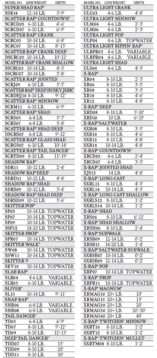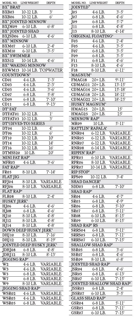 Many factors like line weight & trolling or retrieve speed effects lure swimming depth. Depths indicated are the range of depths that a lure family swims under optimum conditions. See Rapala Depth Chart High Resoution.